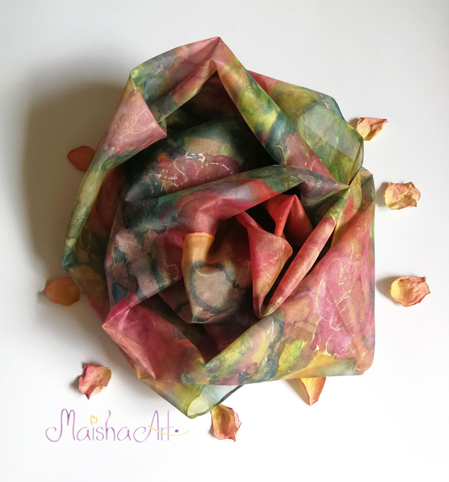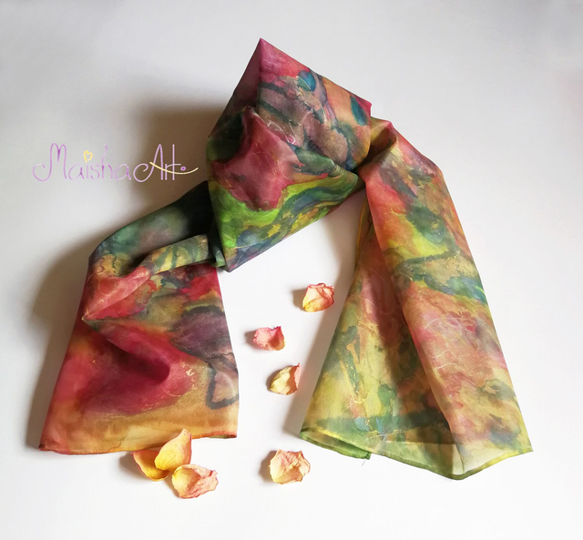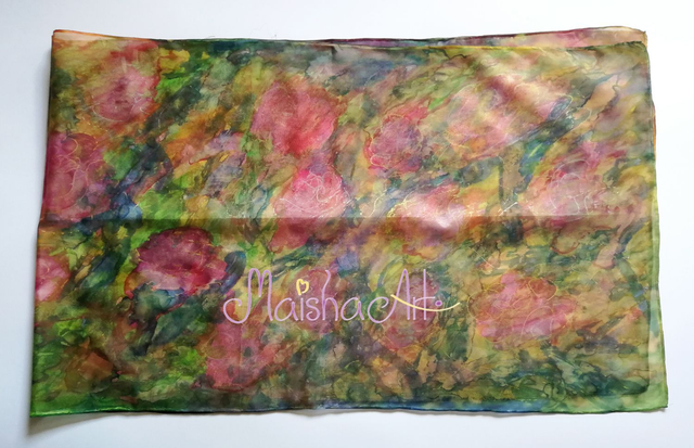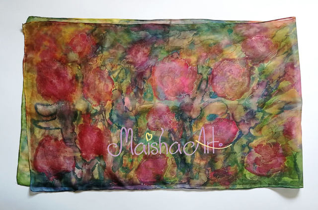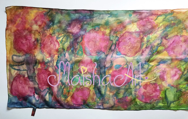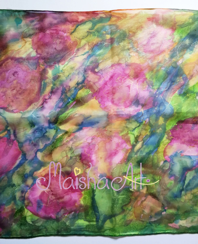 Ročno poslikan svilen šal Čarobne Vrtnice je umetniško delo, stkano iz nežnosti, barv in svetlobe. Na lahki in mehki svili Pongee 05 se prepletajo odtenki roza, zelene, vijolične, turkizne, modre, rumene in zlate, ki simbolizirajo radost, ljubezen in spokojnost. Ko ga ovijete okoli sebe, začutite energijo vrtnic – toplino, lepoto in večno ljubezen, ki sije iz vsake poteze čopiča.