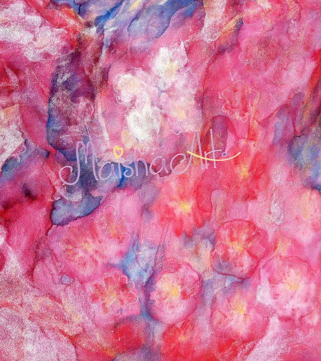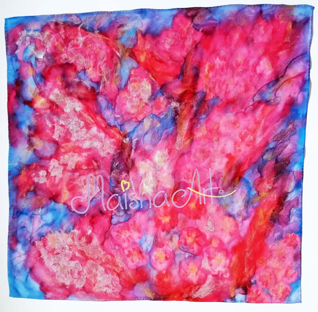 Ročno poslikana svilena ruta Cvetenje je umetniško delo iz 100 % naravne svile Crepe de Chine, ki je kompaktna in lahkotna, zato se lepo poda vsakemu stilu nošenja. V harmonični igri barv – roza, modre, vijolične, srebrne in zlate – se prebuja simbolika pomladi: radost, ljubezen in svežina novega začetka. Ob nošenju rute lahko zaslišite šepet zgodbe: "Smo čarobne cvetoče veje, obdane z zlato svetlobo, lepoto in večno ljubeznijo."