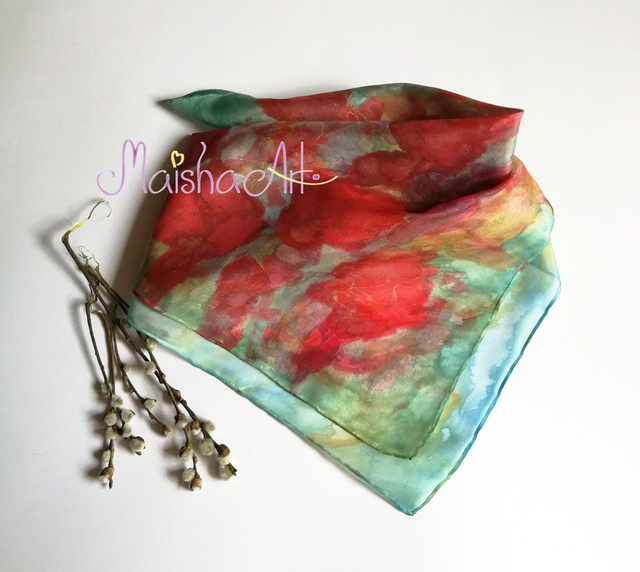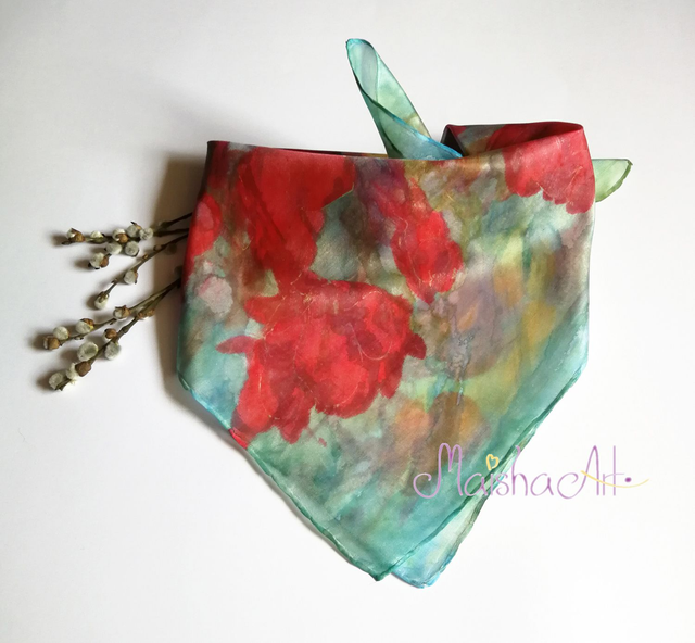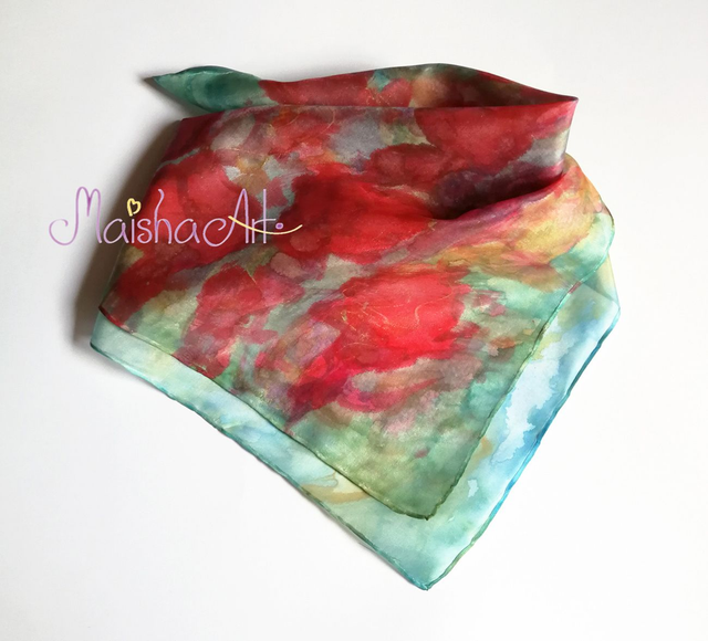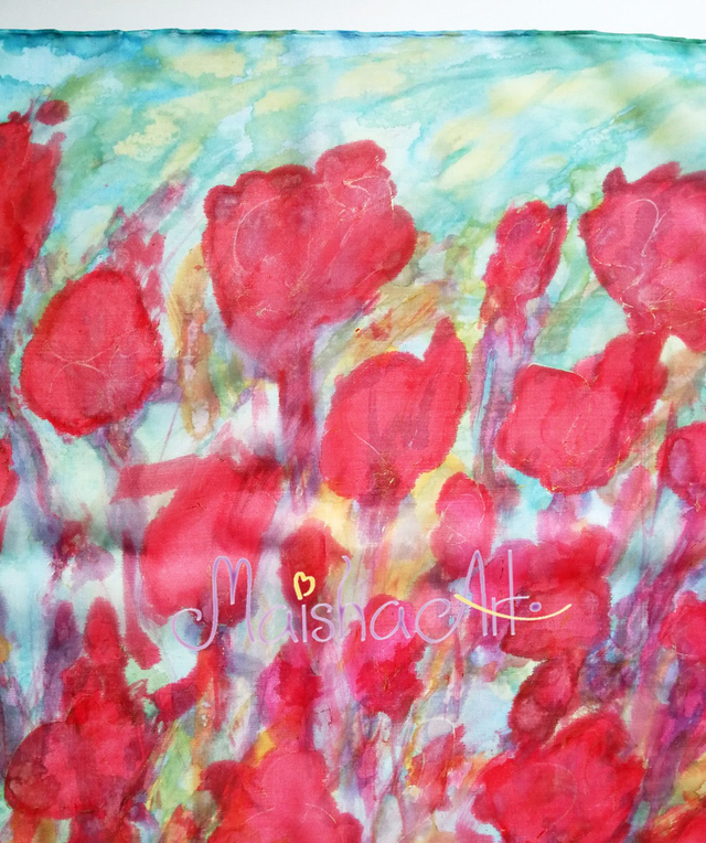 Ročno poslikana svilena ruta Rdeči Maki je unikatni modni dodatek iz 100 % naravne svile Pongee 05, ki je lahka, gladka, mehka in rahlo prosojna. Kombinacija rdeče, modre, rumene, zelene, zlate in magenta barve prinaša moč in vedrino. Ženske bodo pri nošenju rute slišale šepet zgodbe: "Smo radostni maki, ki uživamo v toplem soncu. Obdani smo s svetlobo, lepoto in večno ljubeznijo."