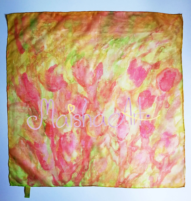 Ročno poslikana Svilena Ruta, Rdeči Tulipani je kot sončen pozdrav pomladi, ujet v nežno in rahlo prosojno svilo Pongee 05. Vsak cvet je naslikan s skrbno roko, barvna paleta rdeče, rumene, zelene, zlate in oranžne pa prinaša toplino, veselje in življenjsko energijo. Pri nošenju rute boste začutili šepet tulipanov: “Smo veseli cvetovi, ki uživamo v toplem soncu, obdani s svetlobo, lepoto in večno ljubeznijo.”
