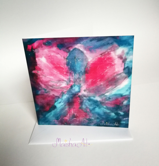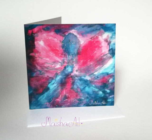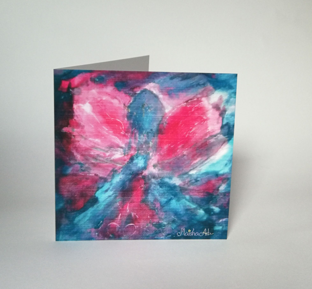 Voščilnica Angel je droben odsev nebesne lepote – odtis originalnega motiva z ročno poslikanega svilenega šala MaishaArt. Nežni modri in roza odtenki prinašajo občutek miru, upanja in varnosti. Angel simbolizira zaščito, svetlobo in ljubezen – zato je ta voščilnica popolna izbira za sporočila, ki prihajajo iz srca.