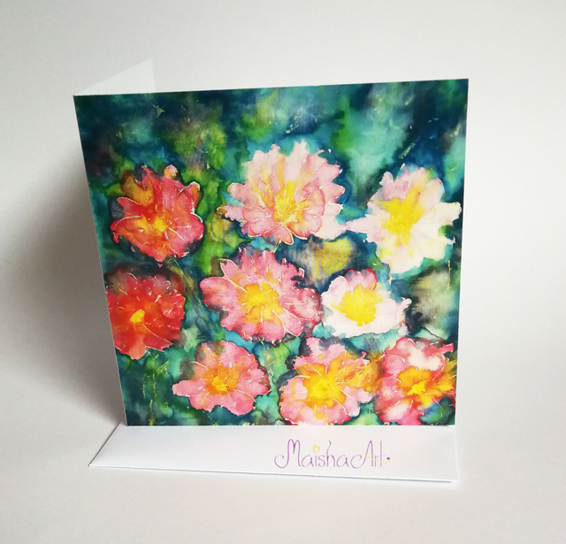 Voščilnica Spomladanske rože je umetniška drobtinica lepote – odtis originalnega motiva z ročno poslikanega svilenega robčka MaishaArt. Nežni rožnati cvetovi s sončno rumenimi sredicami na zelenem travniškem ozadju prinašajo občutek svežine, vedrine in pomladi, ki se prebuja.
